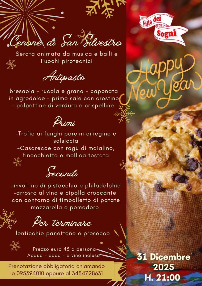 Villa dei Sogni propone presso il ristorante serate a tema con musica live, piano bar e cantanti con ottimi piatti della cucina tipica siciliana e, il sabato sera, pizze cotte in forno a legna.